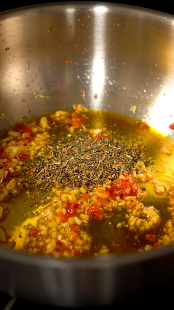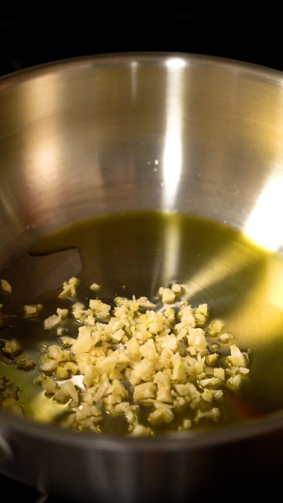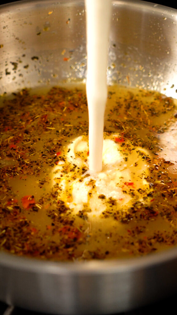 Whereas pasta water involves a boil, in a excessive walled skillet or saucier pan, over medium low warmth, add the vegan butter or olive oil and soften / warmth up. Then add within the minced garlic, calabrian chiles or purple pepper flakes, and Italian seasoning. Stir to mix and prepare dinner for 1 minute ensuring you do not burn the garlic or herbs.