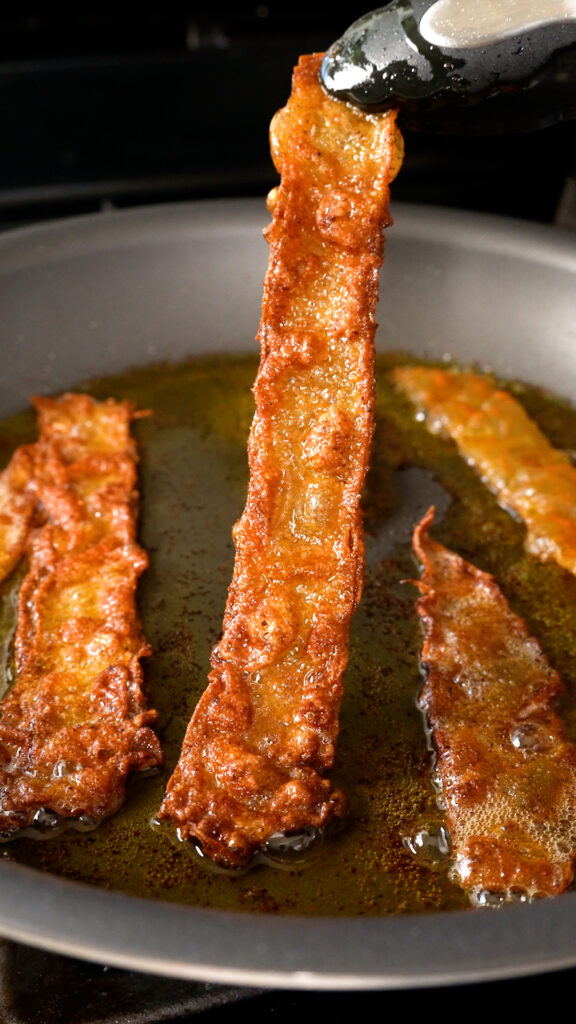 Lastly, fry the rice paper strips up in a bit oil! You’ll possible want to do that in batches.