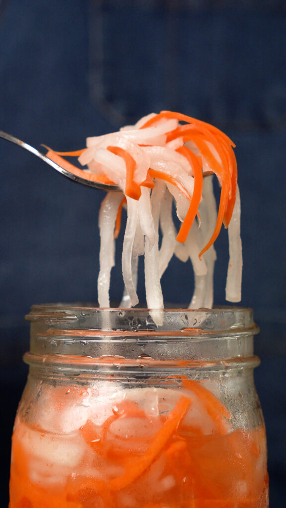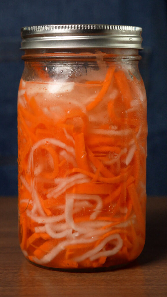 Whisk collectively the 1/4 cup of sugar, water and vinegar till the sugar is dissolved. Pour over the carrots and daikon and guarantee they’re lined. Add extra water / vinegar if wanted to cowl. You should utilize them instantly, and might maintain the within the fridge for as much as one month.