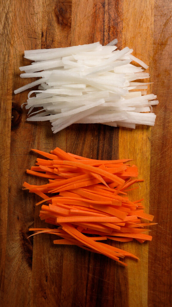 Peel the carrots and daikon radish. You may want about 2 carrots, and 1/3 of a medium daikon radish. First lower them into planks, after which into matchsticks. You must have about 2 cups of every.