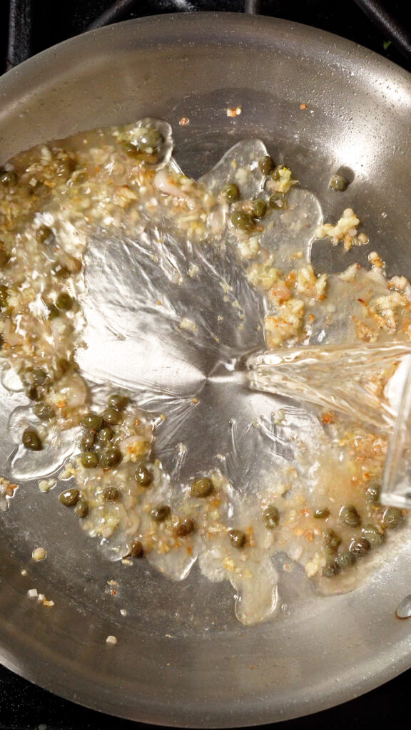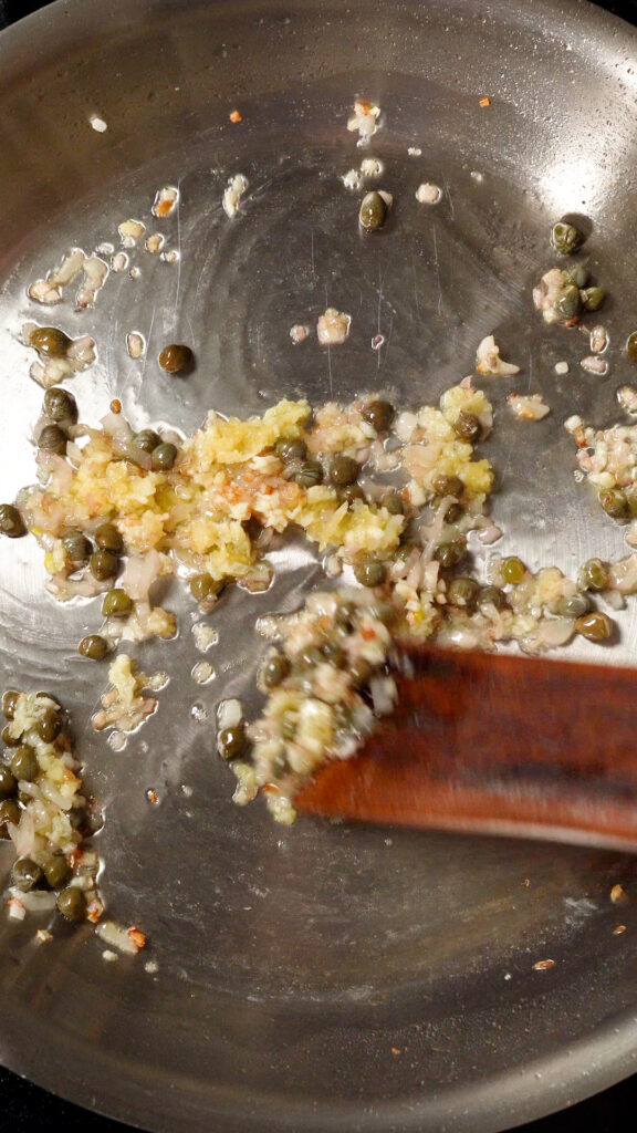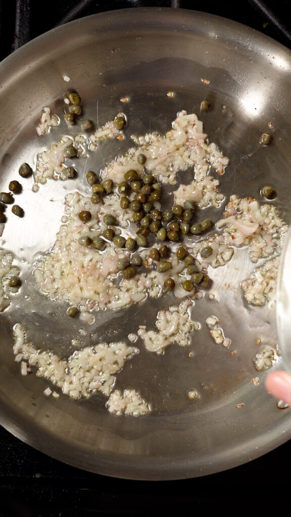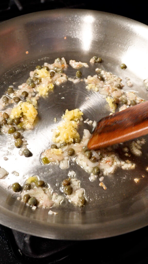 To make the Picatta Sauce, heat up some Olive Oil, then add in the shallots, cook for 1 minute, then add in the capers and garlic. Cook for another minute.