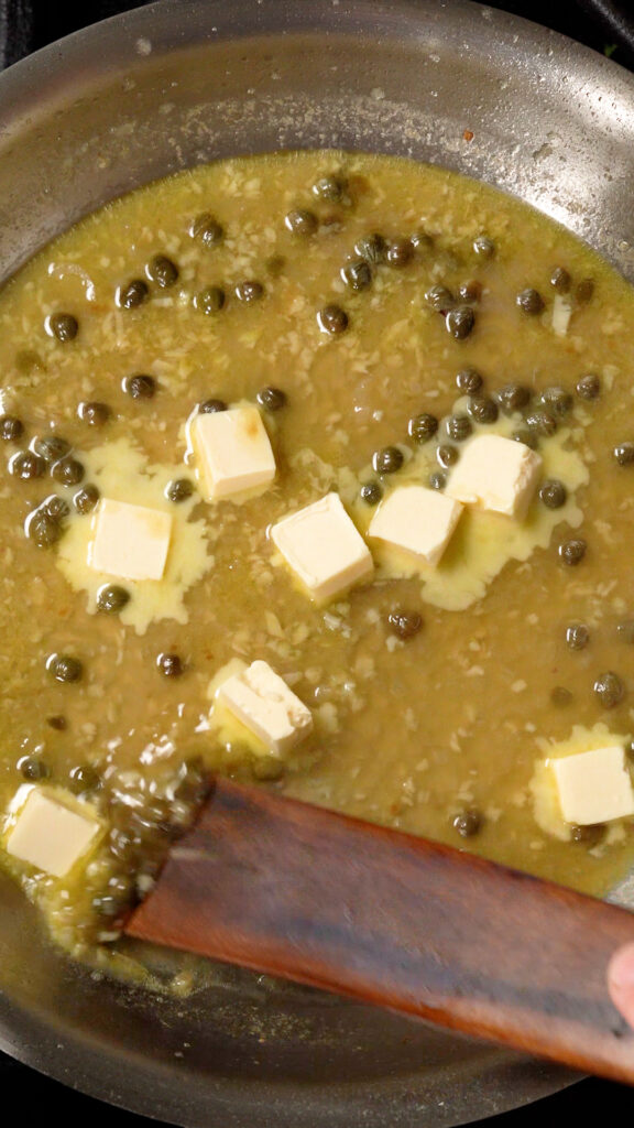 Then add in the wine and broth and reduce for 5 â 6 minutes. Melt and whisk in the vegan butter. Finish off with lime juice (and zest) and fresh herbs. Add the tofu filets back in to heat through and serve!