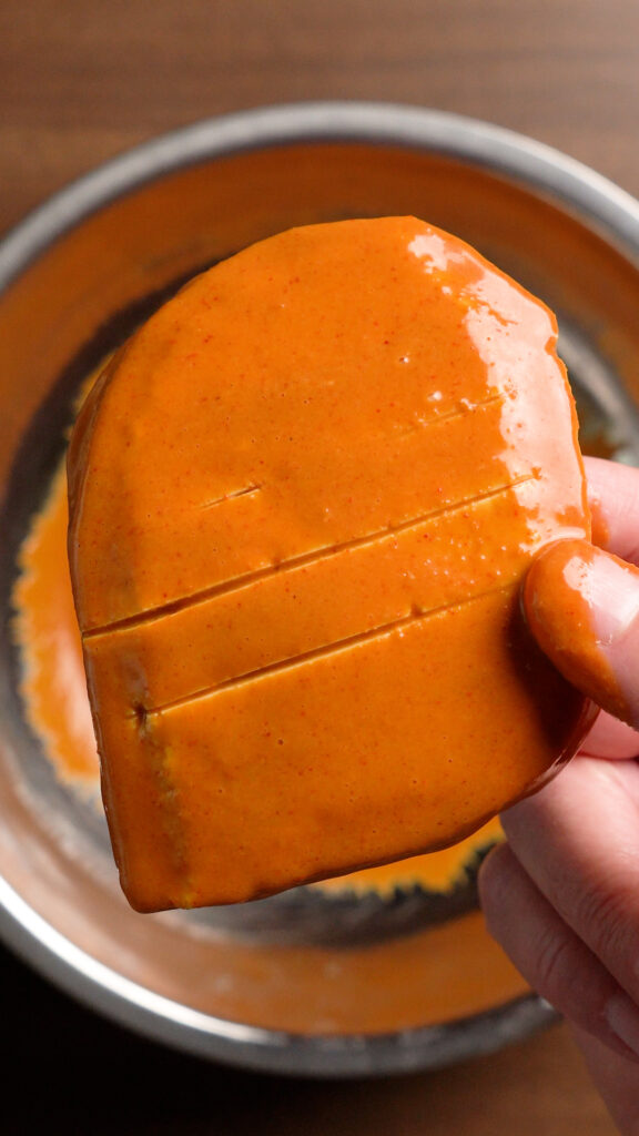 Once your filets are looking good, score them lightly so the marinade can penetrate a bit more. I like to score them one way on both sides. Make sure you donât score too deeply as this will make the fillet a bit more delicate and might fall apart. But scoring will create a more âshreddyâ texture as well.