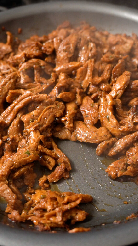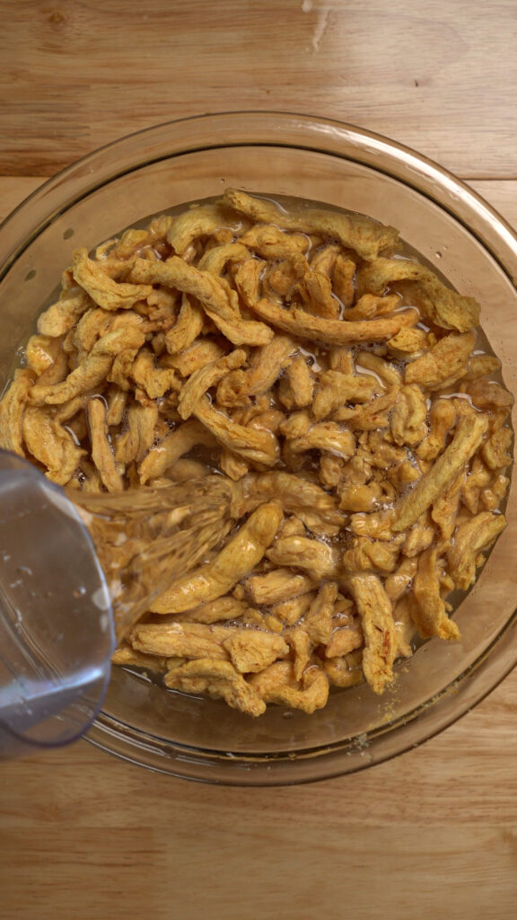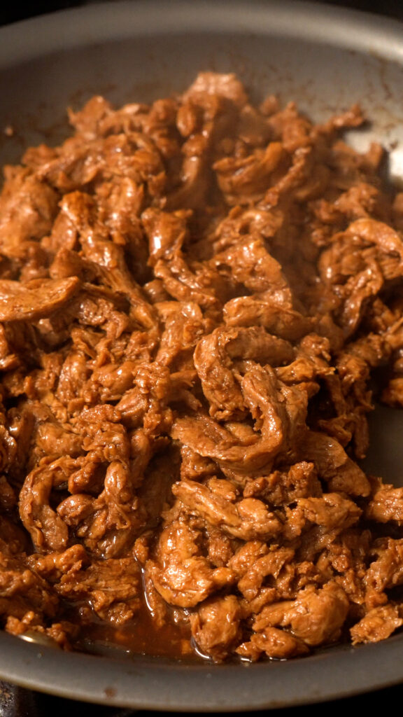 Luckily, all we need to do is rehydrate the soy curls, then reduce them down in a beefy marinade.