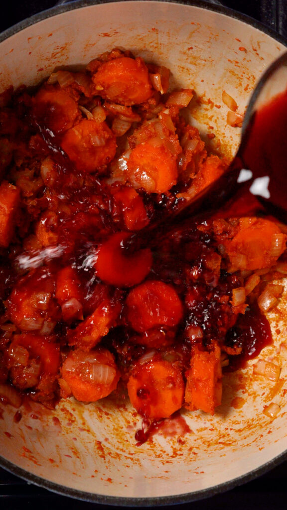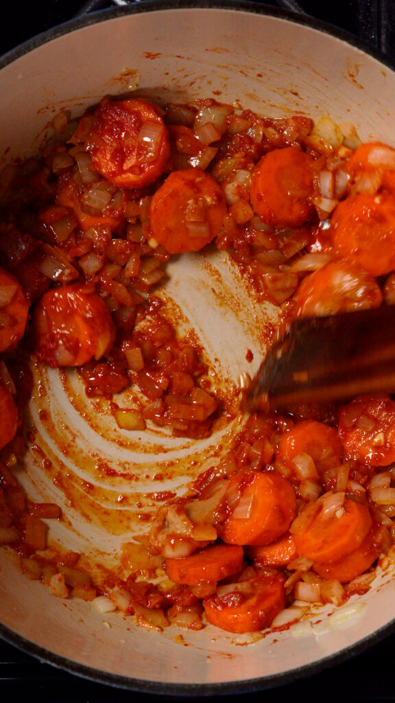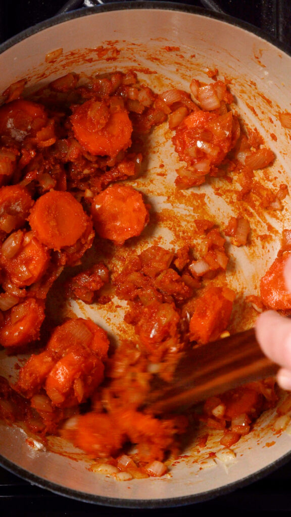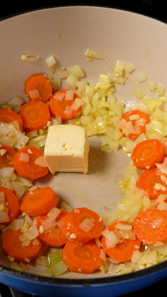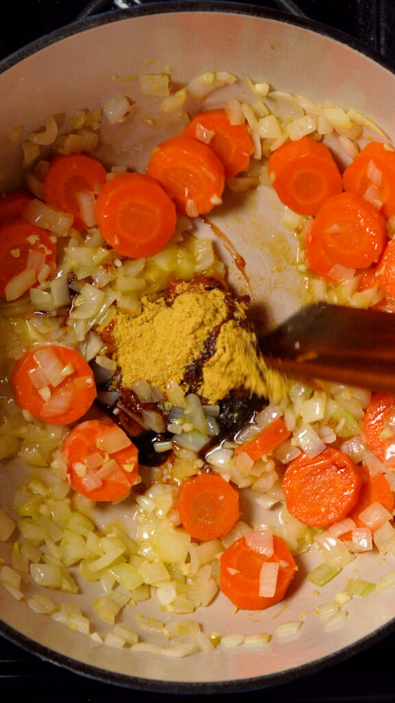 Then, reserve the soy curls and to a Dutch Oven over medium heat, add the carrots and onions. Cook them down for about 8 â 10 minutes or until theyâve softened a bit.