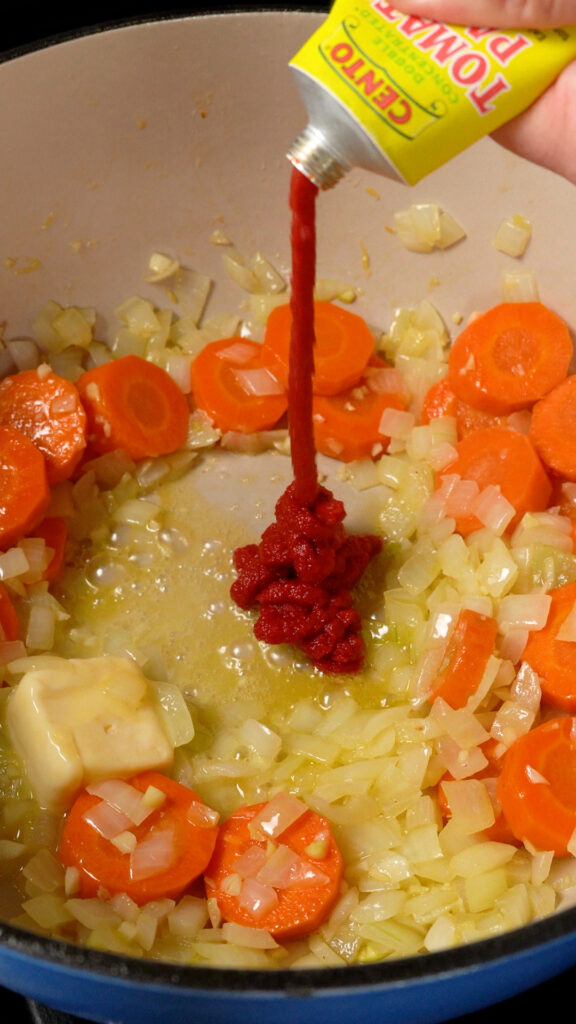 Next toss in the tomato paste, nutritional yeast, miso paste and vegan worcestershire. Stir to combine.