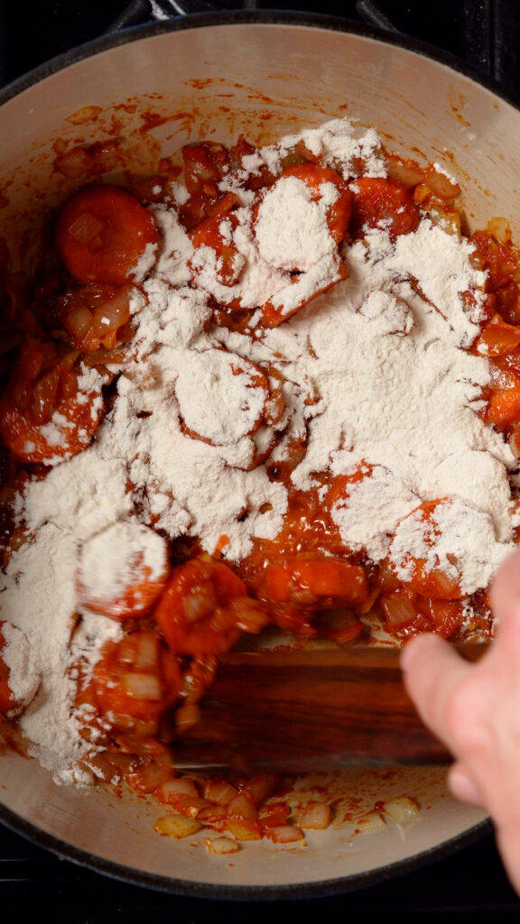 Stir that to combine, add in some flour, stir and cook off the raw flour for a minute. Next add in the wine and broth.