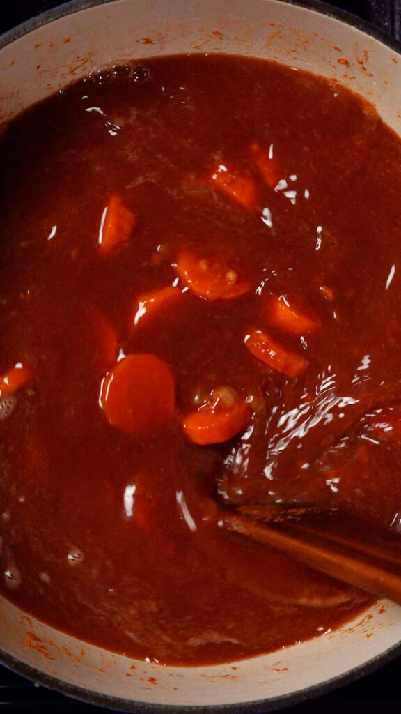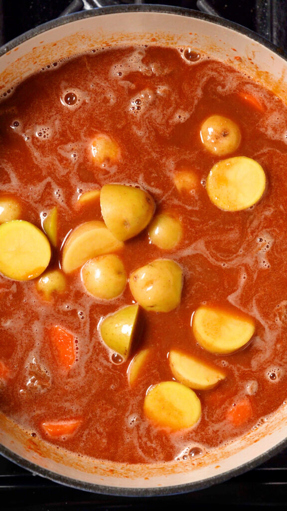 Add in the soy curls and potatoes. Bring to a simmer, then add the pot uncovered to an oven preheated to 350 F / 175 C for 30 minutes.