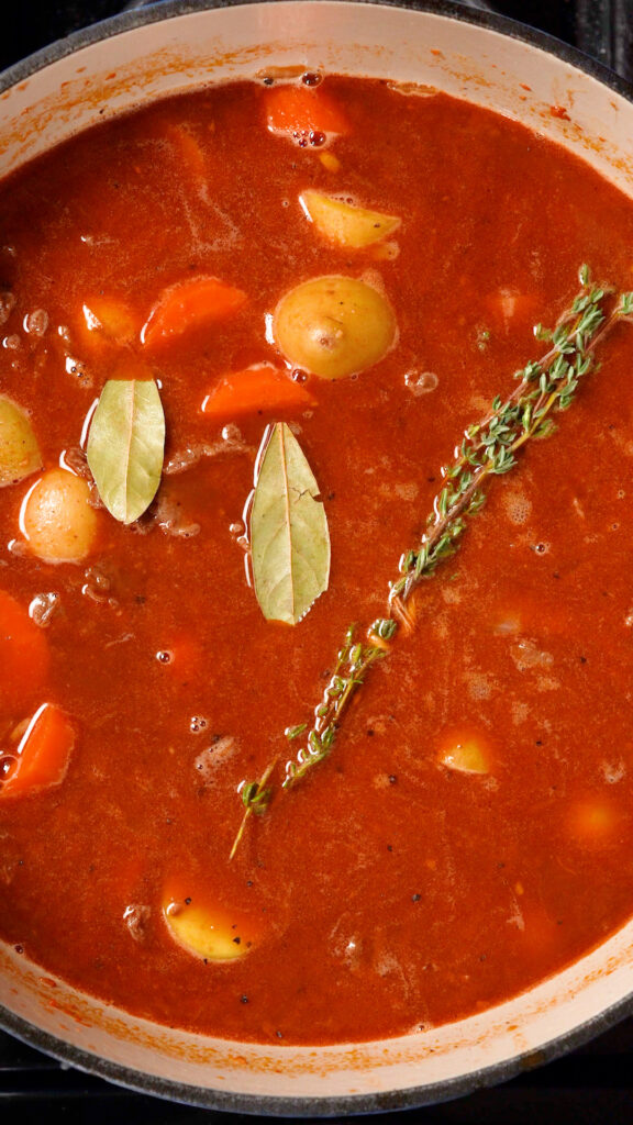 Next add in the broth and red wine if using. Stir to combine. Then add in the reserved soy curls and potatoes. Toss in the thyme and bay leaves. Taste and adjust for seasoning. Bring to a simmer.