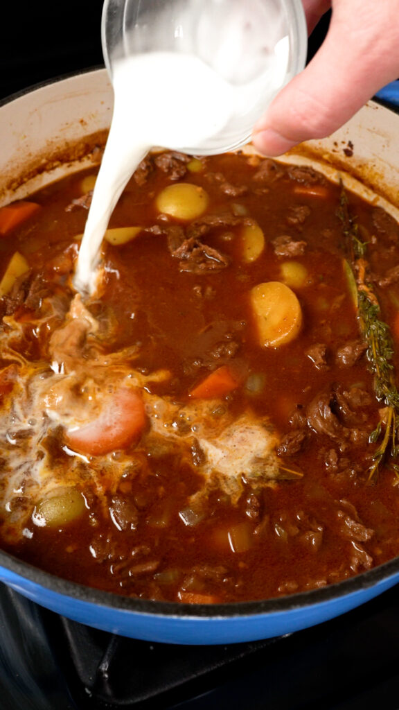 Combine the cornstarch and water in a small bowl. Remove the pot from the oven, and add in the cornstarch slurry and stir to combine. Check to see if the potatoes are fork tender. If they are cooked to your desired doneness, skip to the next step. Otherwise add the pot back to the oven for another 10 â 15 minutes.