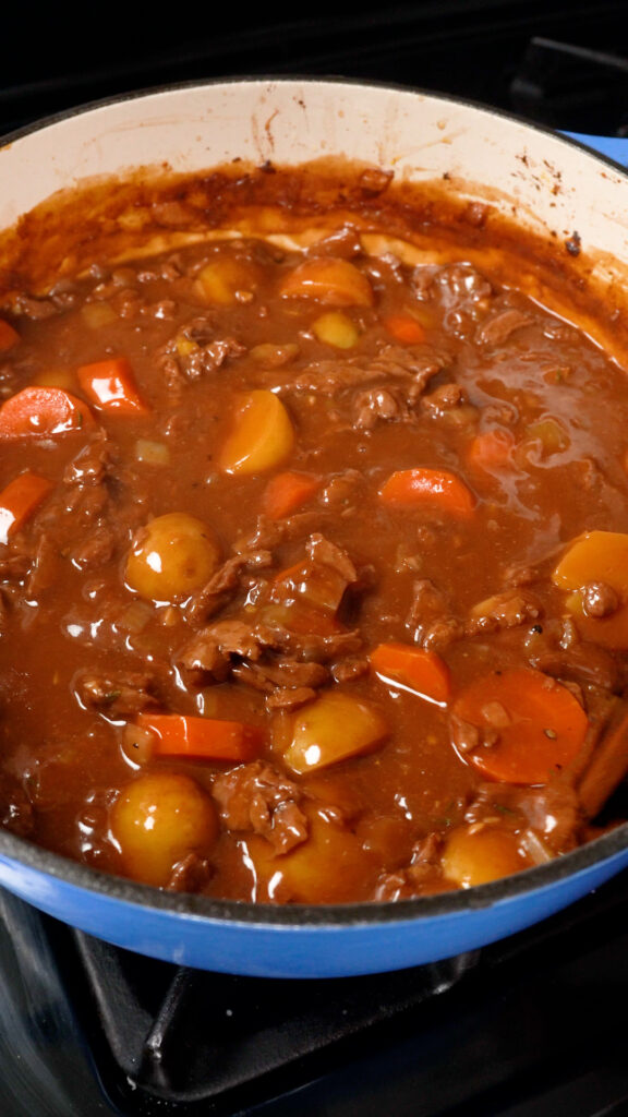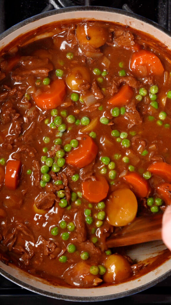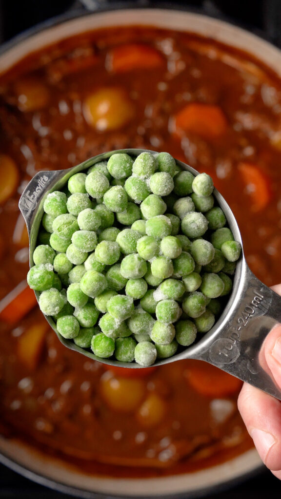 Once veggies are cooked through and stew has reduced a bit, add the frozen peas, stir to heat through. Taste and adjust for seasoning.
