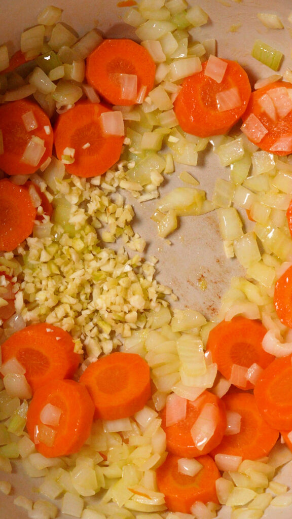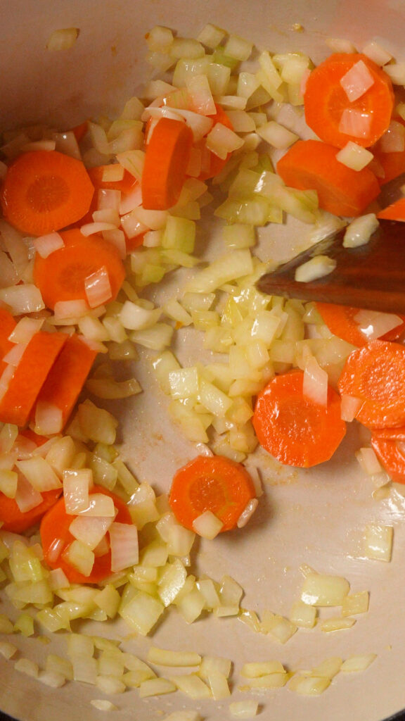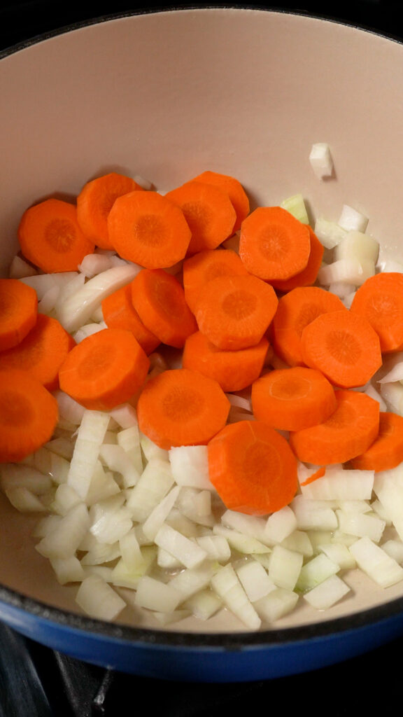 In a large pot or dutch oven, over medium heat on the stove top, drizzle about 1 tbsp of cooking oil (Avocado, Olive, Vegetable etc). Then add in the diced onions and carrots. Add a pinch of salt, stir occasionally, and cook those down for about 10 minutes or until they have softened and the onions get translucent.