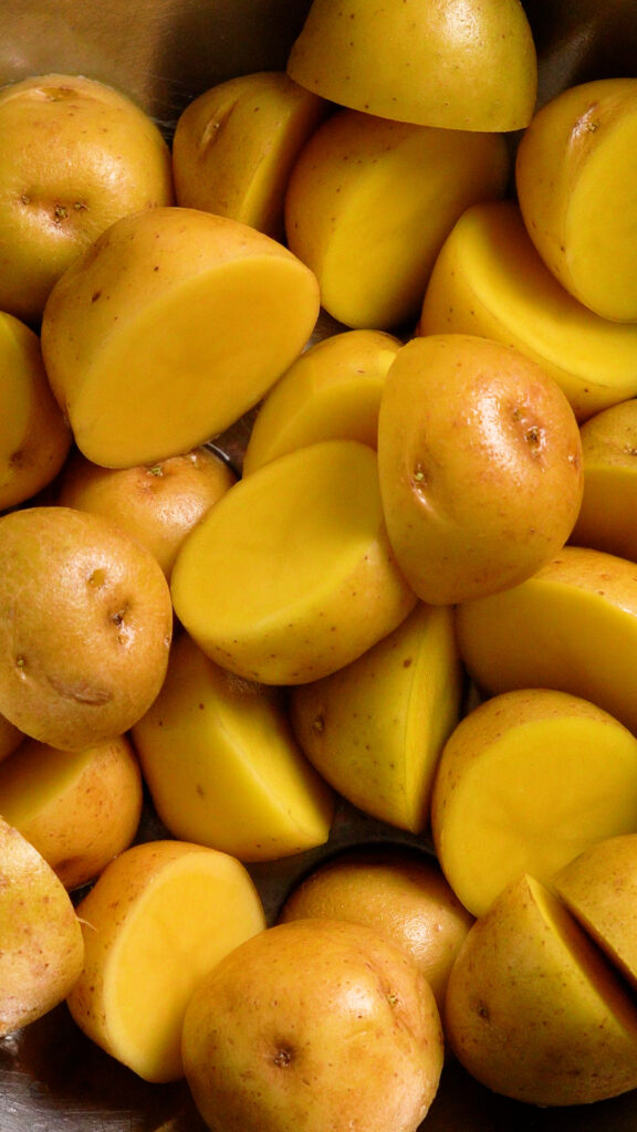 Same with the potatoes! I like using Baby Yukon Golds. Just cut them into equal sized pieces. If they are small enough you can just cut them in half. Otherwise you may need to quarter them.