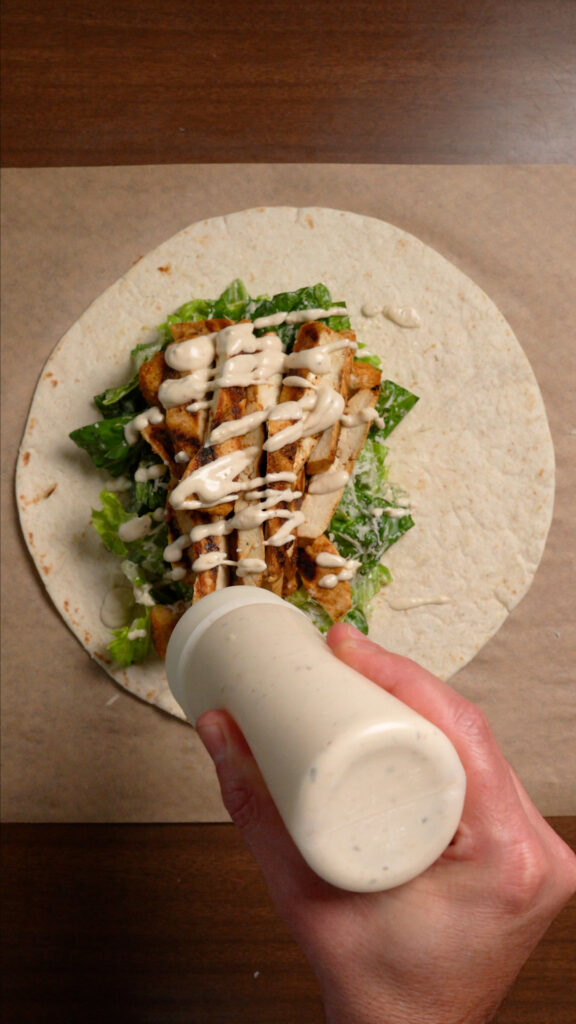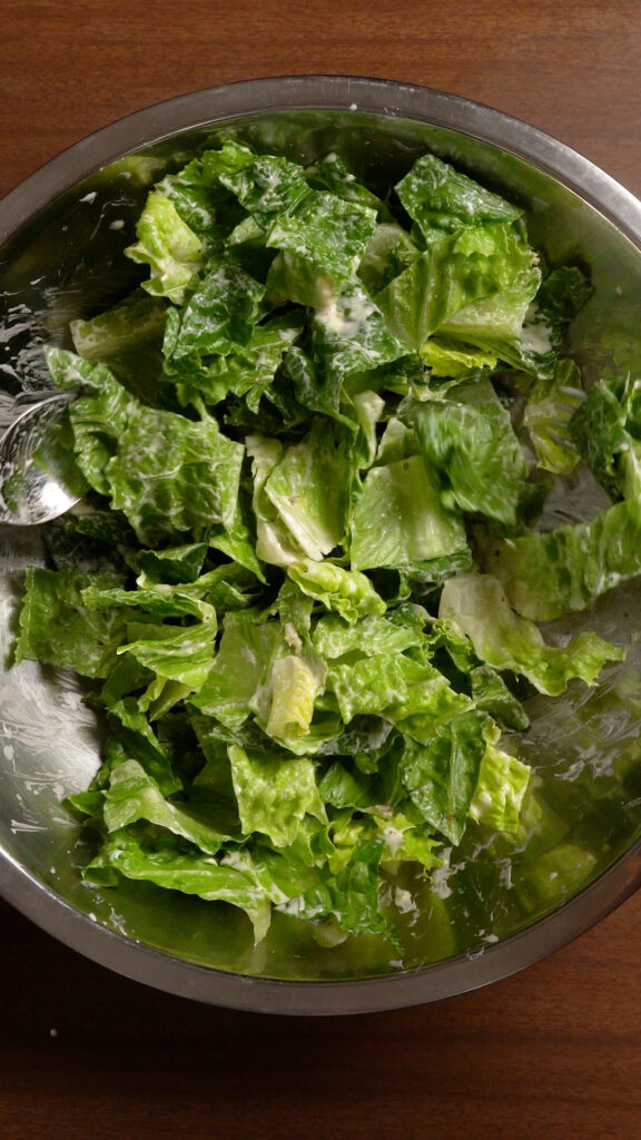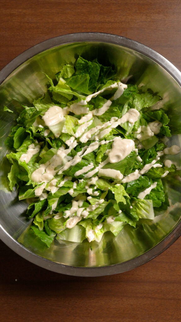 Toss some of the dressing with the Romaine, I like to do about 2 tablespoons per 4 cups / 140g of salad.