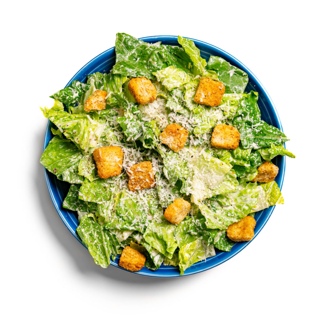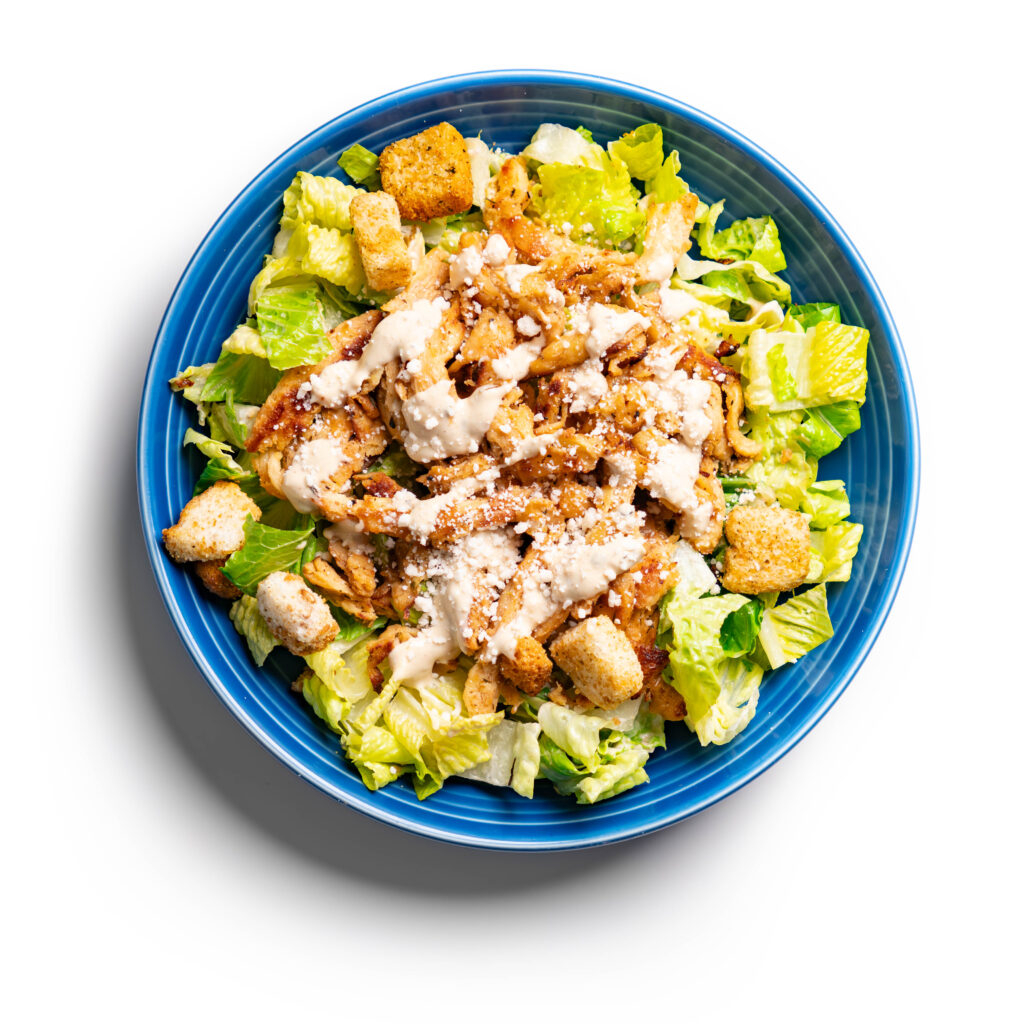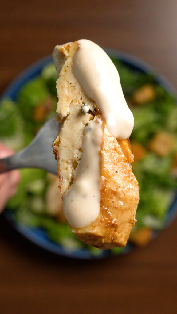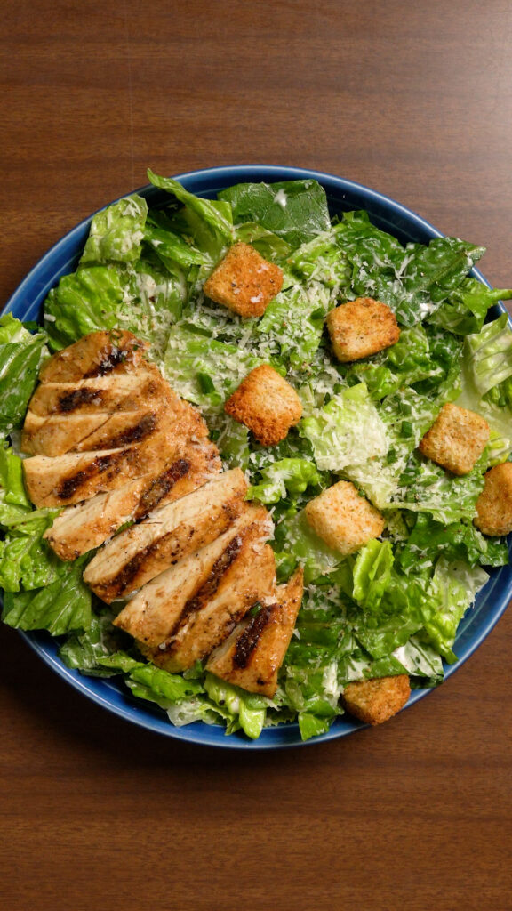 To serve as a salad, simply top the dressed lettuce with the vegan chicken (you can slice it or dice it as you like) and then add as many croutons as you’d like. Top with freshly grated or shaved vegan parmesan.
