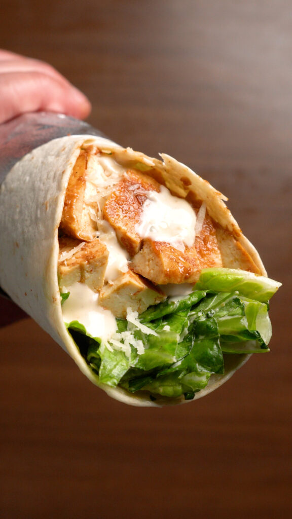 Then just top it with a Vegan Chicken Cutlet, some Croutons, Vegan Parmesan and anything else you like! Serve as a salad or wrap!