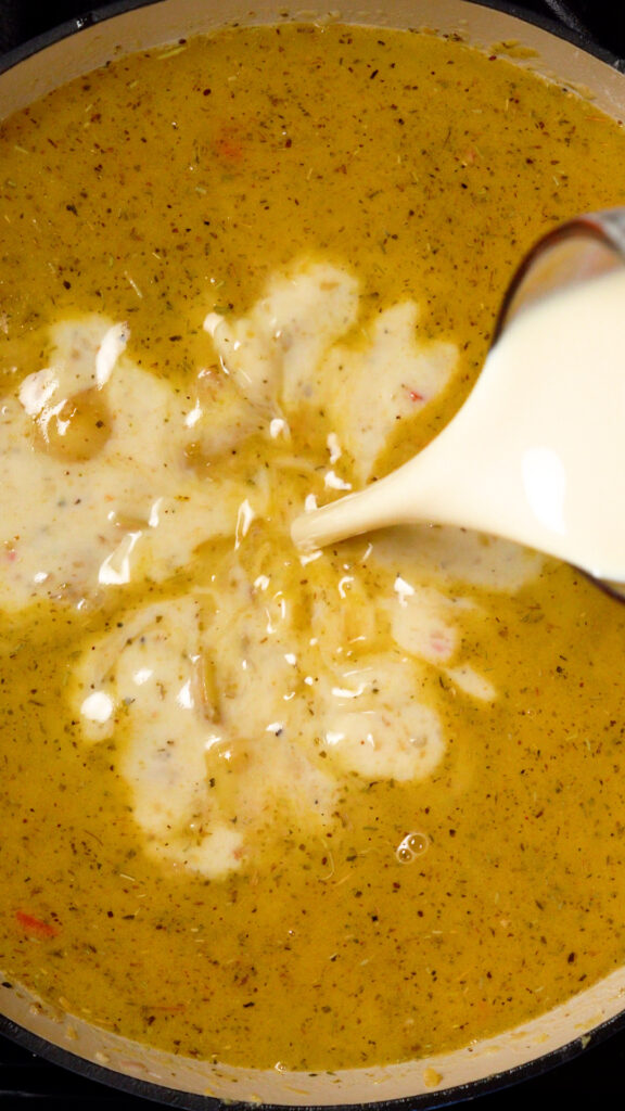 Next add in Vegan Chicken Broth, Plant Milk, Dijon Mustard and Vegan Parmesan. Start with 3 cups of broth and 1 cup of plant milk, and add more if needed after we add everything else in.