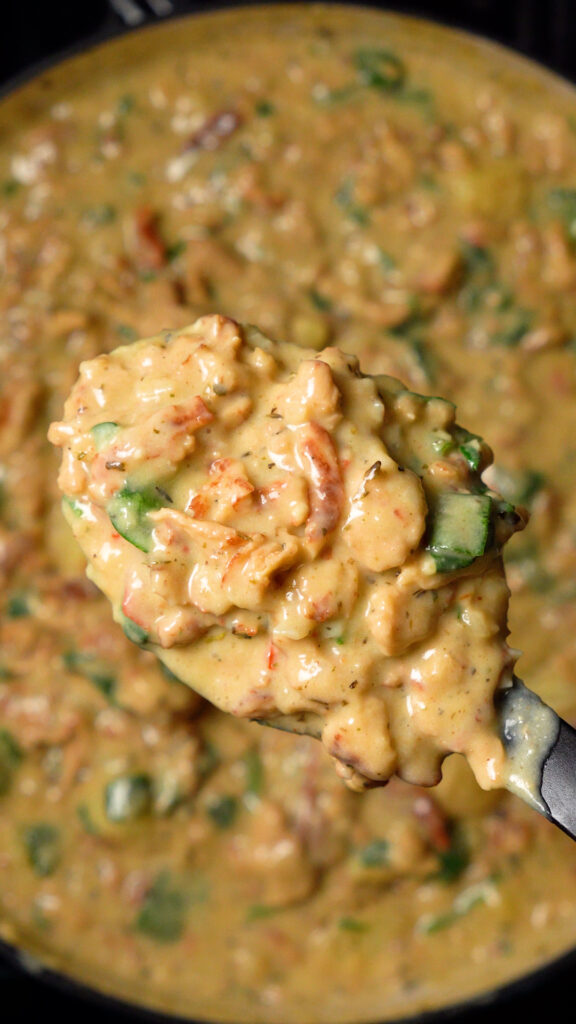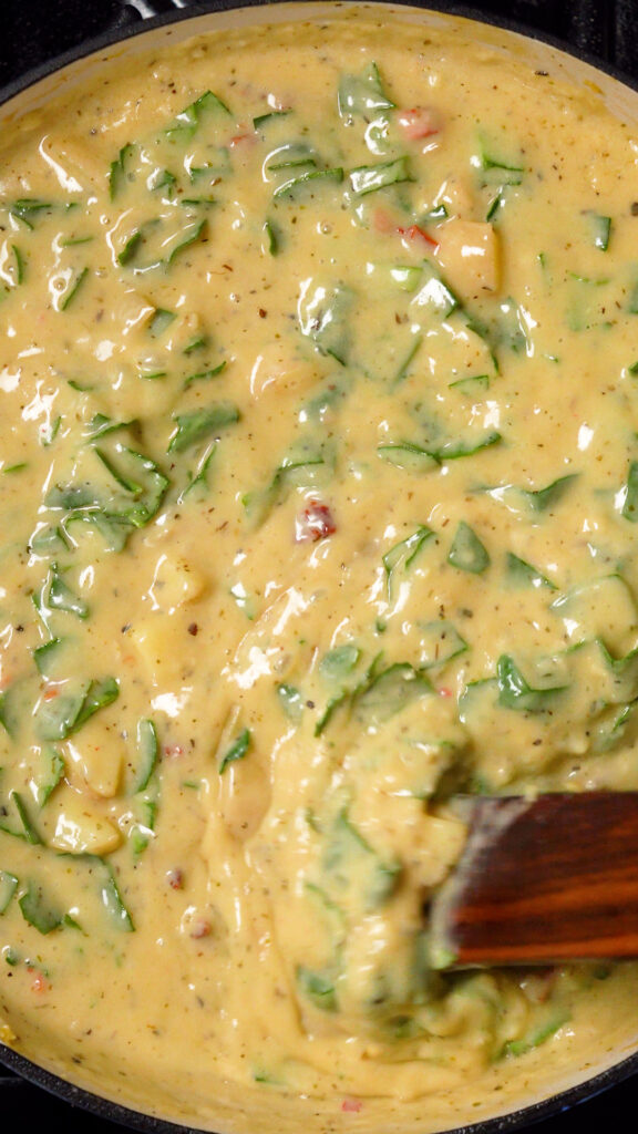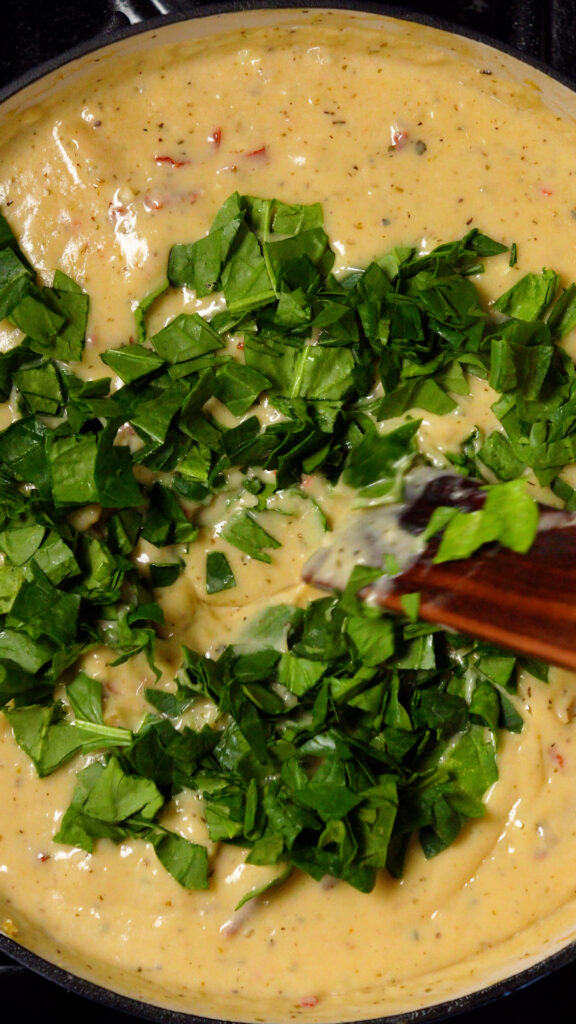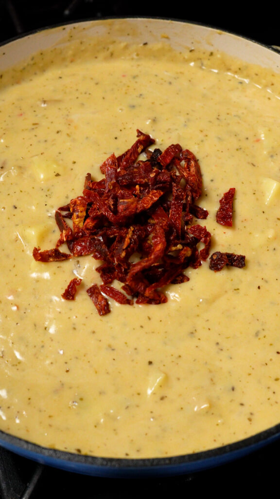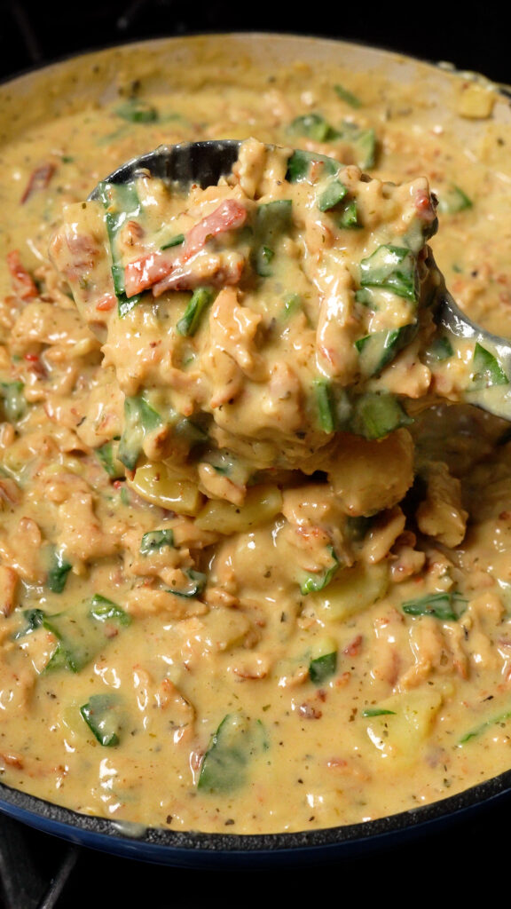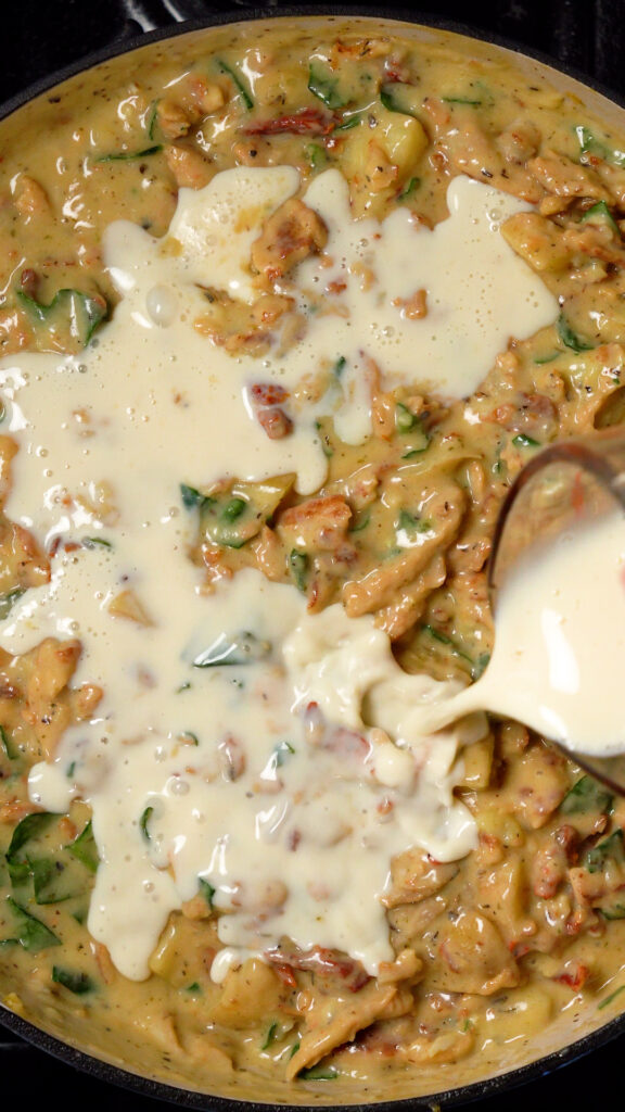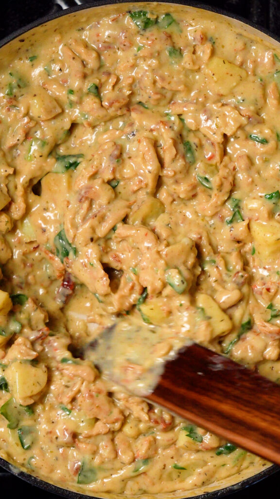 Once potatoes are cooked through, add in the sun-dried tomatoes and spinach, followed by the reserved vegan chicken. Stir to combine. If the mixture feels to thick, add in enough broth or milk until it’s at your desired thickness.