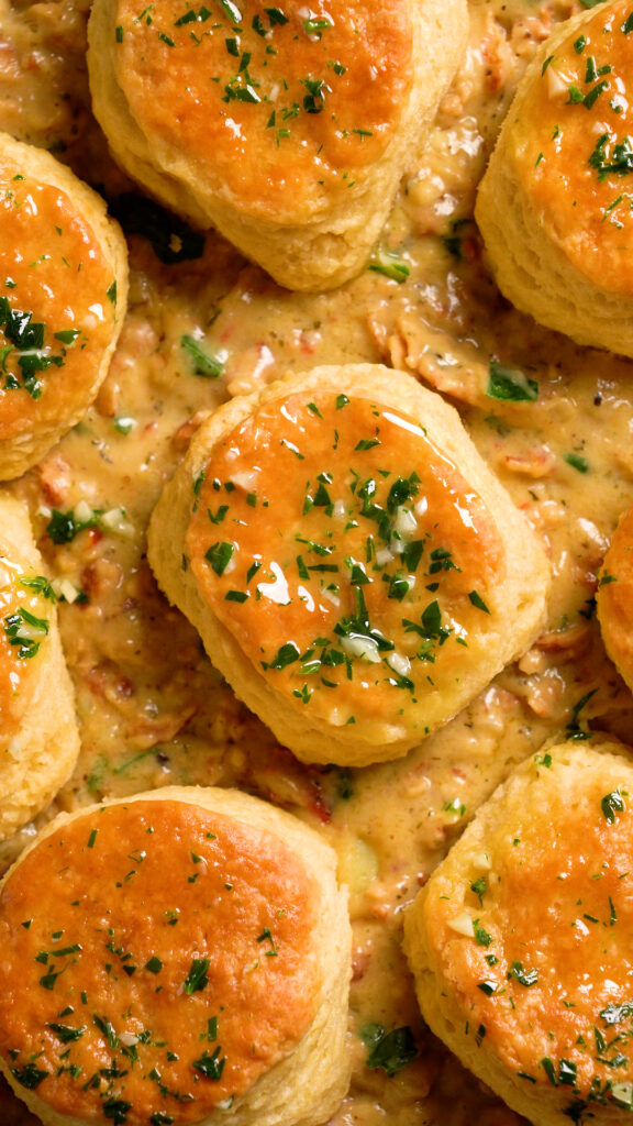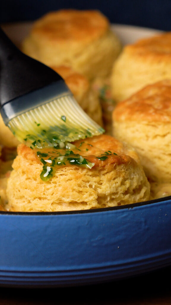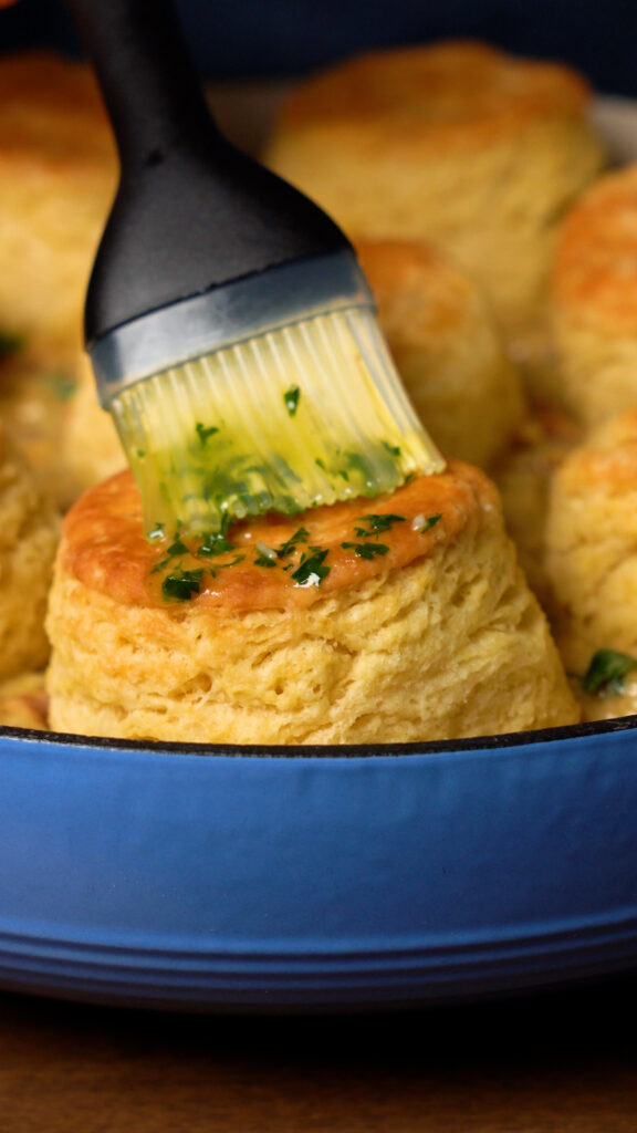 Then top with cooked Biscuits, and brush them with some melted vegan butter mixed with minced garlic and chopped parsley.