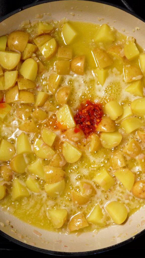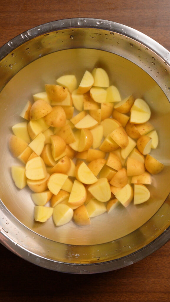 Marry Me Tofu is great served with potatoes, so this dish has potatoes in it! I recommend some Baby Yukon Gold variety. You wanna chop them into bite size pieces. So depending on the size of the potato, you can half or quarter them.