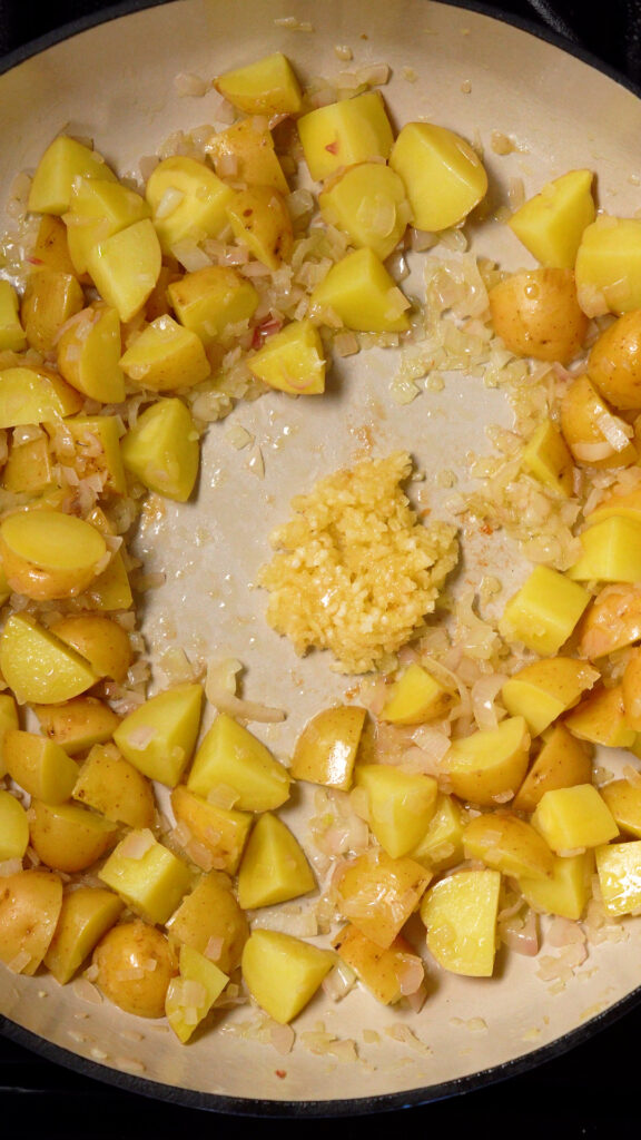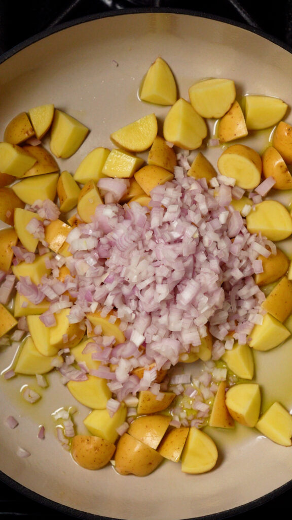 Next get a 12″ cast iron pan or similar. Heat it over medium heat, then add in 1 Tbsp of cooking oil. Add the diced potatoes and shallots and stir. Cook for 8 – 10 minutes or until shallots have softened and gone translucent.
