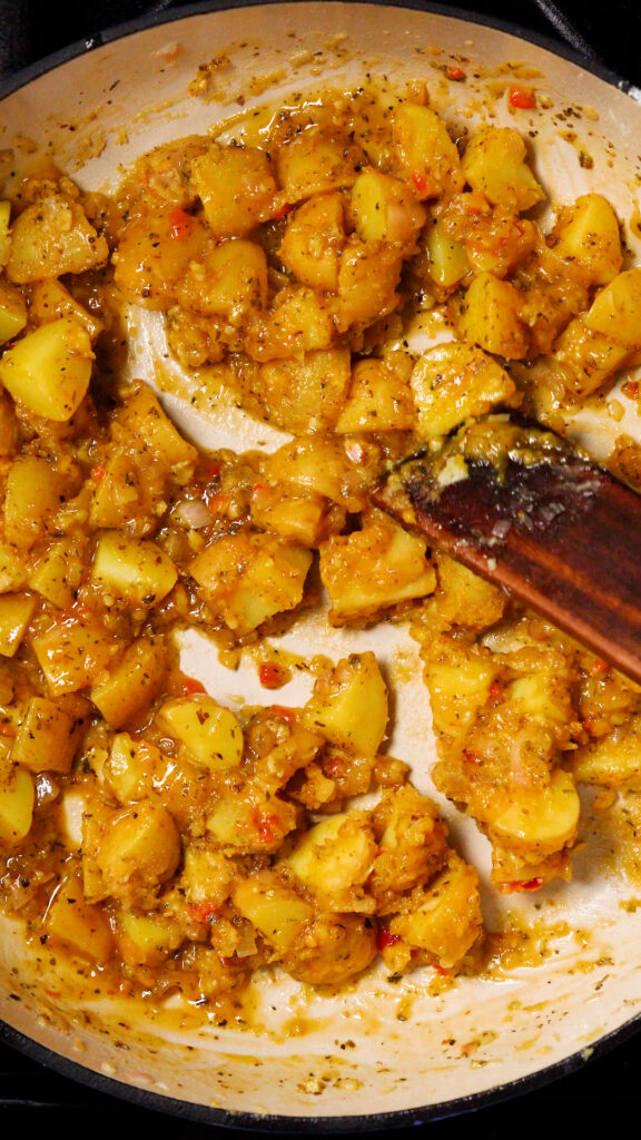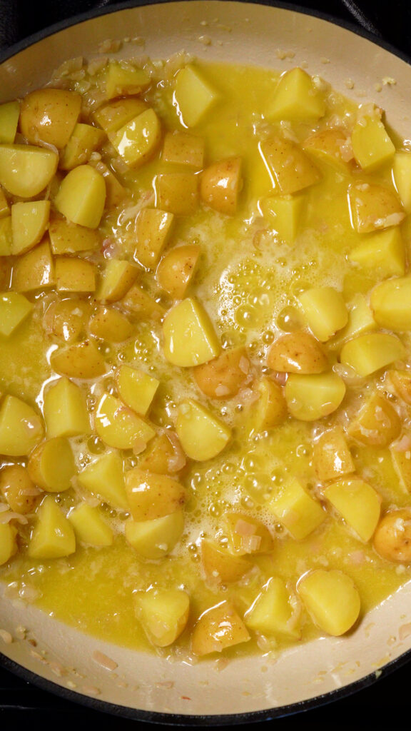 Bring to a light boil and cook the potatoes until they are fork tender. About 15 – 20 minutes. The sauce will thicken considerably too.