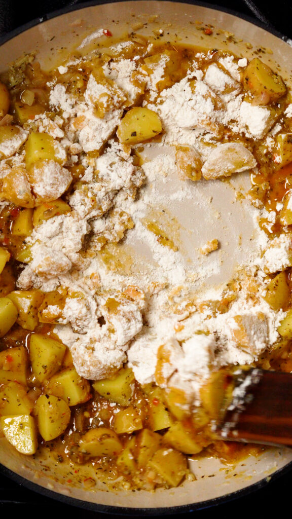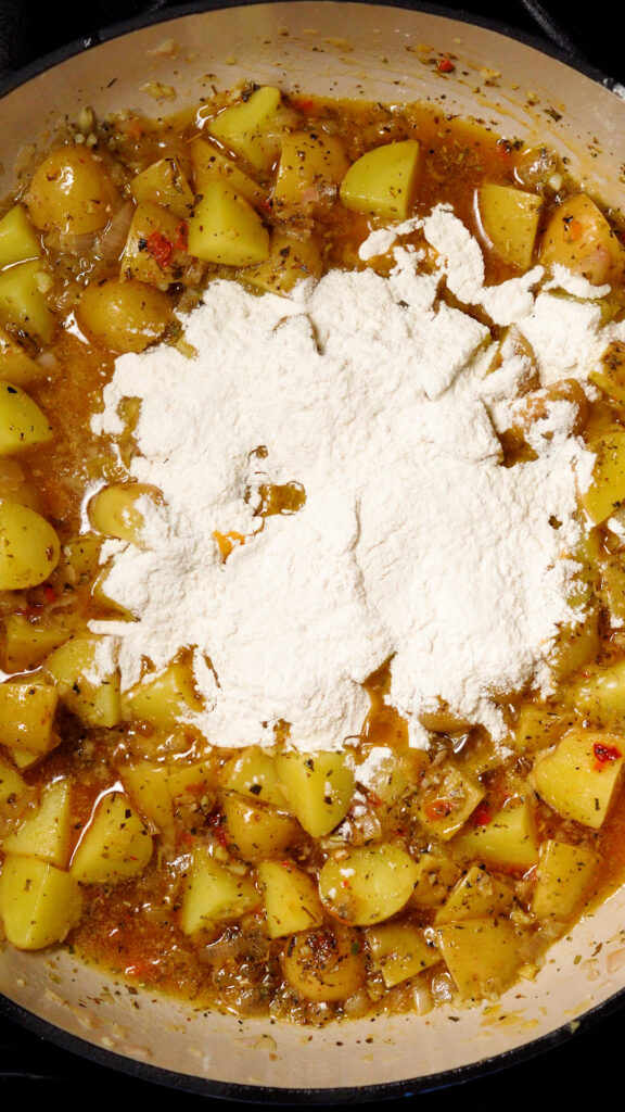 Then add in the Calabrian Chile and Italian Seasonings. Stir to combine, and then add in the flour and stir that. Cook for a minute to get rid of the raw flour flavor.