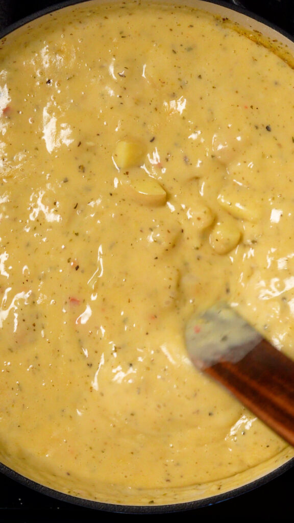 Cook this on medium until the potatoes are fork tender, and the mixture is thick and creamy.