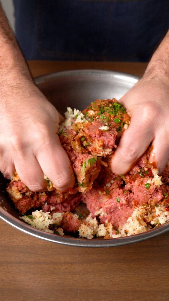 Once onions and garlic have cooled, and breadcrumbs are moistened, add everything for the meatloaf to a mixing bowl and combine with clean hands. Once meat is well combined, cover and refrigerate for 30 minutes.