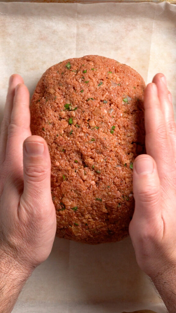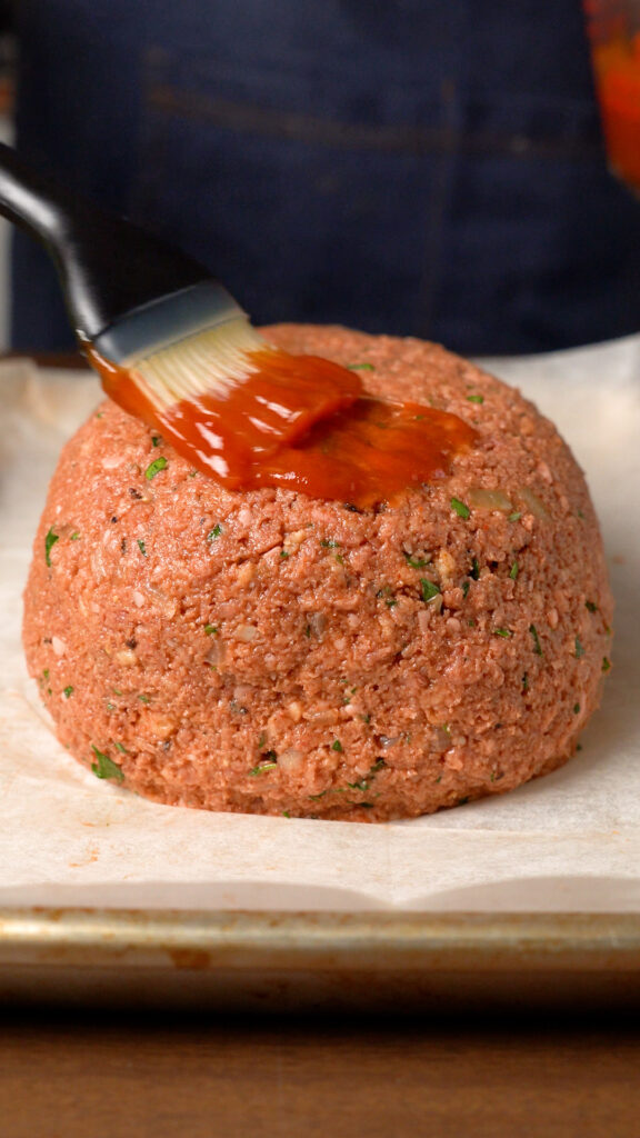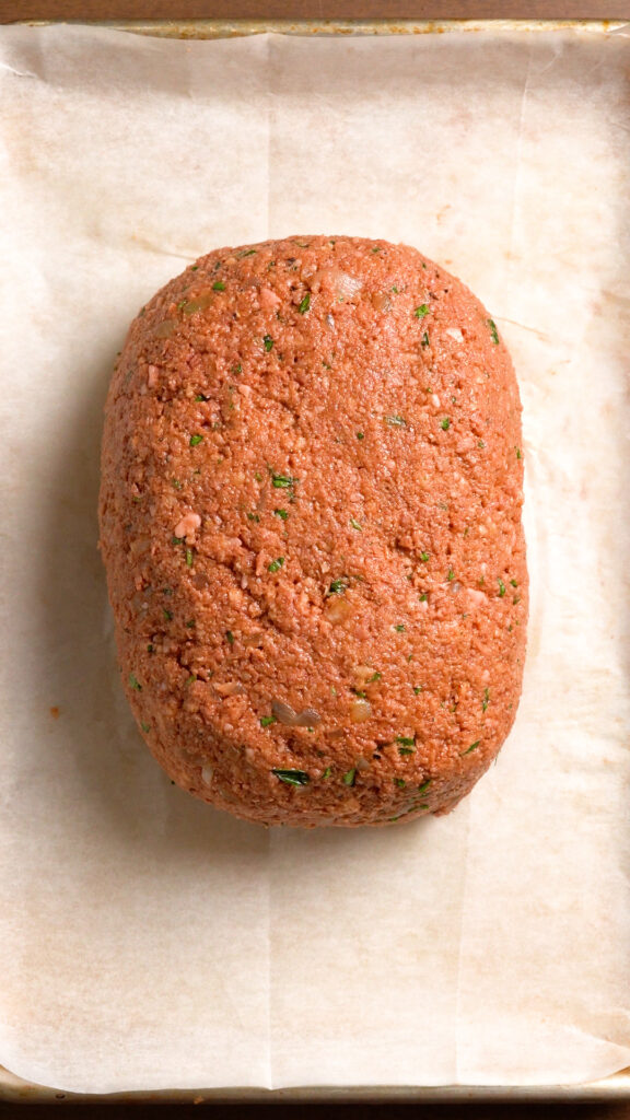 Shape the meatloaf mixture into a loaf. Pack it but not too tightly (unless you like a really dense meatloaf!) Add the meatloaf to a parchment lined baking sheet.