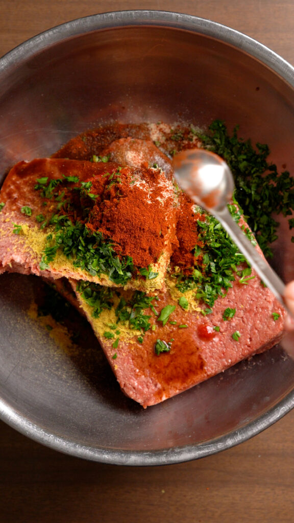 - the MEAT – I wanted this to be an easy recipe, so I’m simply using some store-bought plant-based meat. In the US, that’s likely Impossible or Beyond Meat, but use whatever you like!