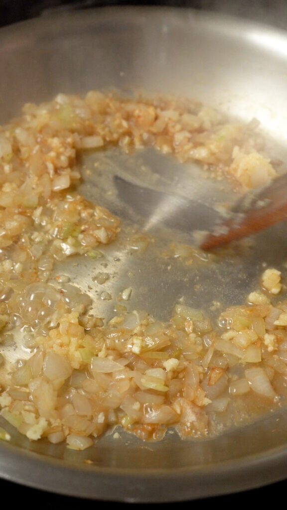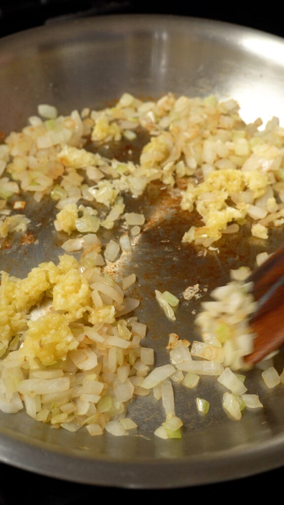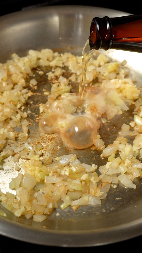 This couldn’t be easier! First, saute your onions and garlic. I used a stainless steel pan so I got a bit of fond which I deglazed with some beer but that is totally optional!