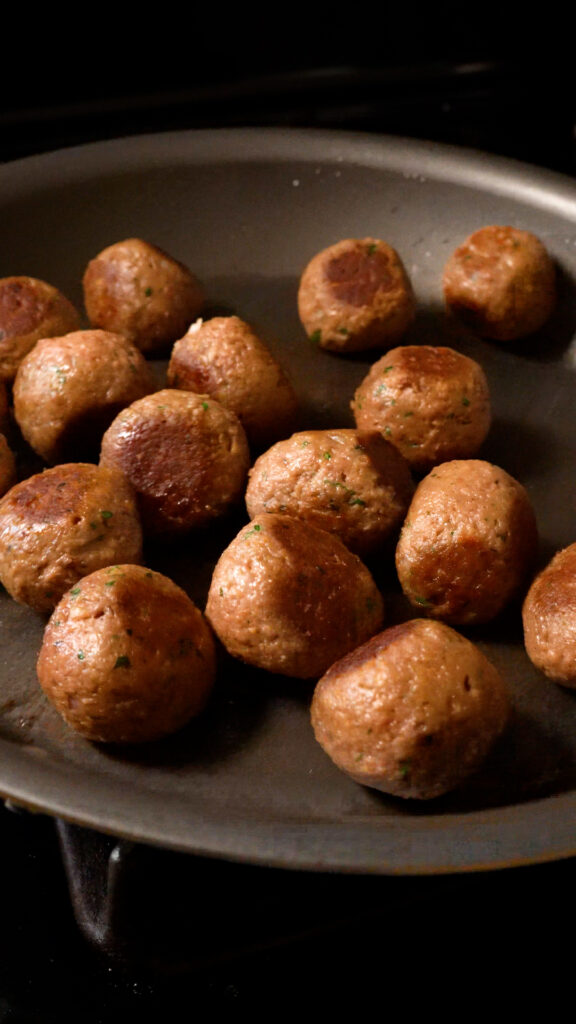 When all meatballs are rolled, add some oil to a pan over medium warmth. As soon as oil is heated, add the meatballs and brown them on all sides.