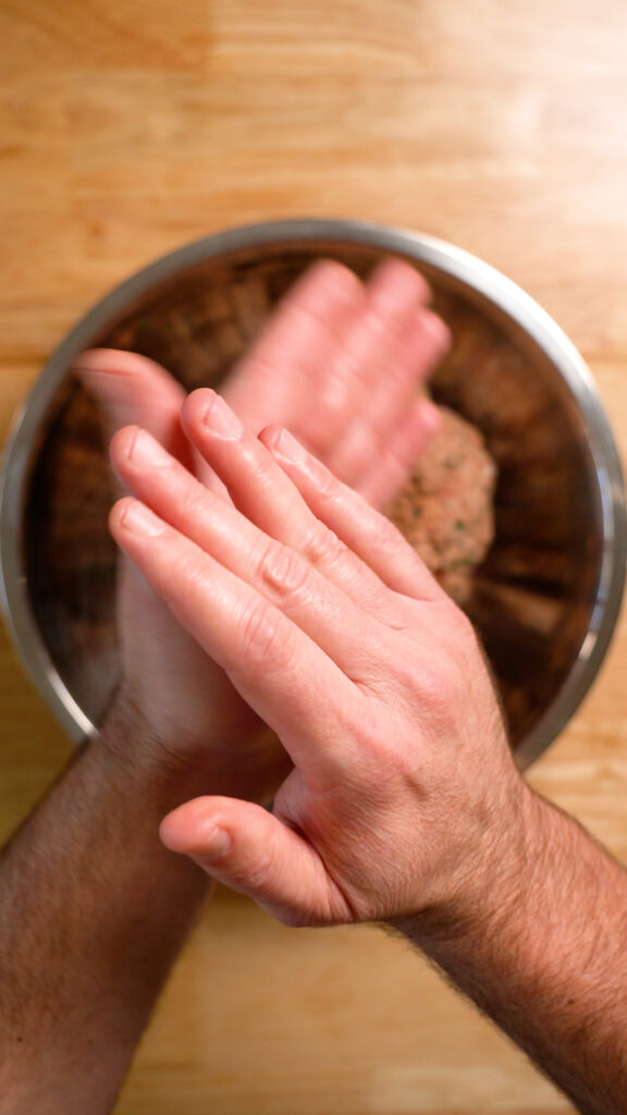 In a bowl, mix all of the elements for the meatballs and blend together with your fingers or a spatula (I discover fingers are one of the best and it is enjoyable!)