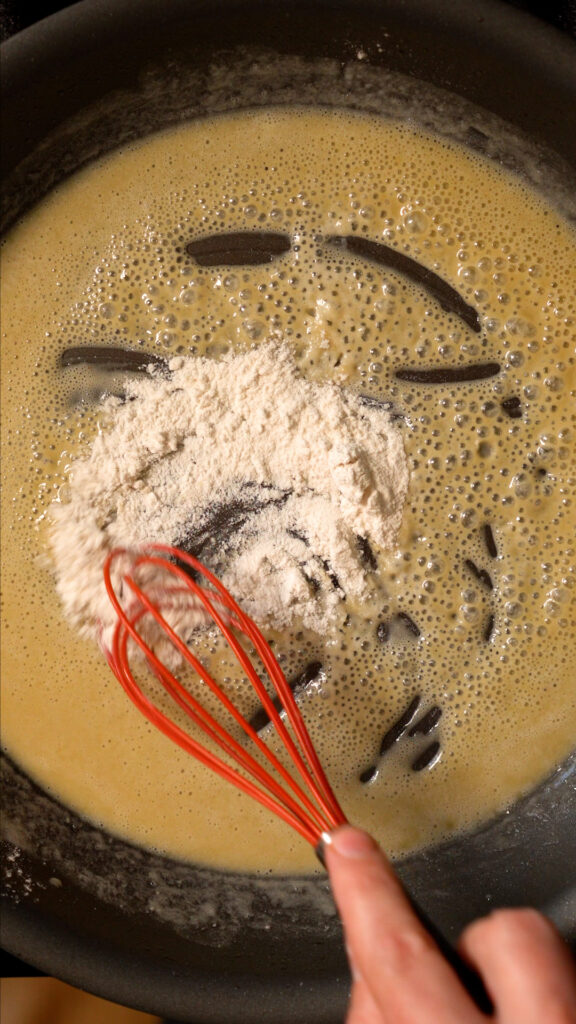 In the identical pan let’s make the gravy. Add the vegan butter and soften. As soon as melted, whisk within the flour a tablespoon at a time to kind the roux. Prepare dinner for a minute or so.